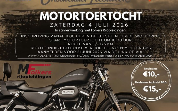 Zaterdagochtend 4 juli staat de motortoertocht op de planning! De route is +/- 175 km en start bij de feesttent op De Woldbrink. De route eindigt bij…