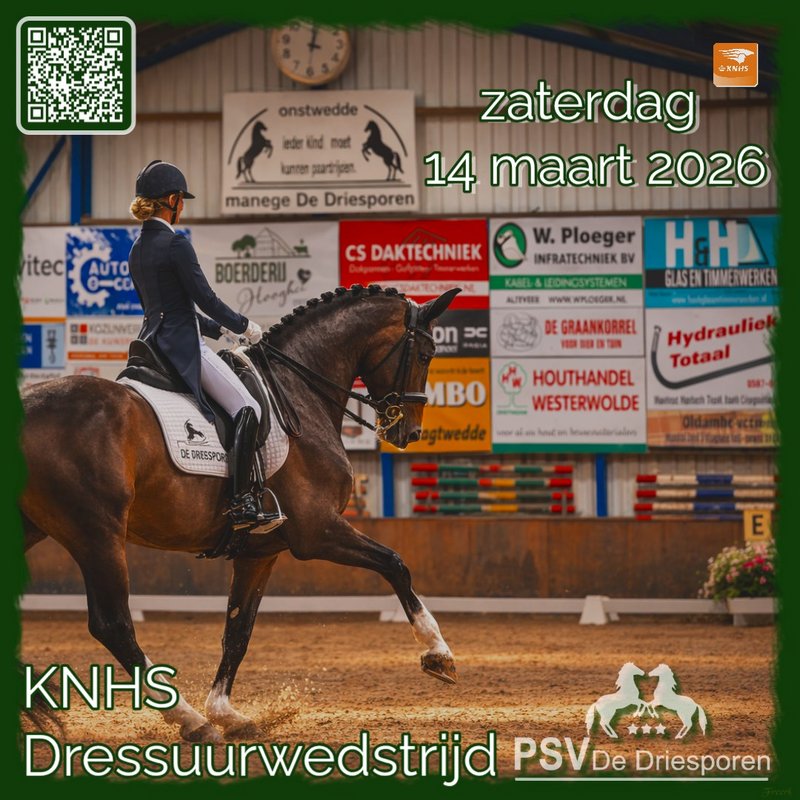 Op zaterdag 14 maart 2026 organiseert Paardensportvereniging De Driesporen een officiële KNHS-dressuurwedstrijd.