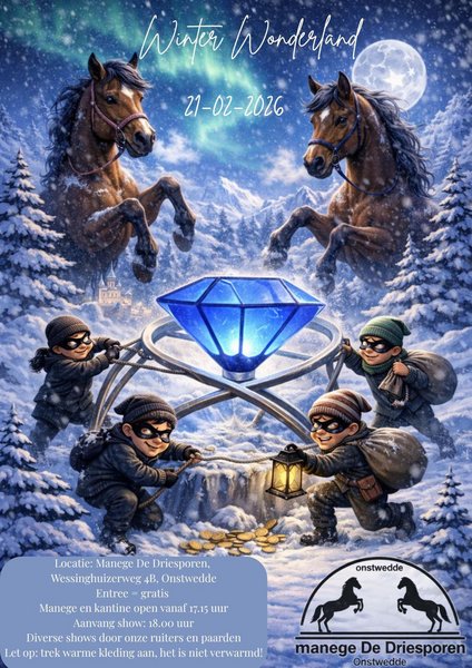 Een avond vol magie, sneeuw en spectaculaire paardenshows! Ruiters en paarden nemen je mee in een betoverend Winter Wonderland bij Manege De Driesporen op 21 februari.
