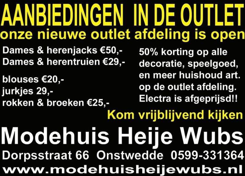 Leuke aanbiedingen in de outlet!! Bij Heije Wubs Mode & Huishoudelijke Artikelen.
