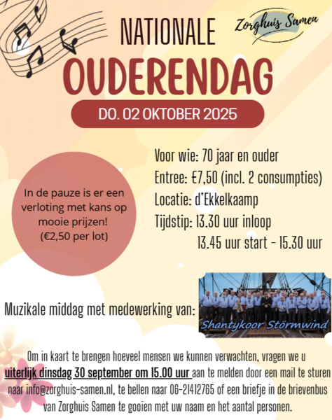 In het kader van de Nationale Ouderendag organiseert Zorghuis Samen op 2 oktober een feestelijke middag in d'Ekkelkaamp voor onze zorgvragers, samen met alle mensen van 70 jaar en ouder uit het dorp Onstwedde.