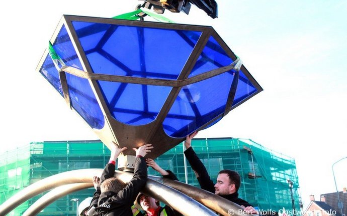 Glazen diamant van rotonde in het Groningse Onstwedde nu in Elsloo. PERSBERICHT 1 JANUARI 01.00 UUR ELSLOO-VESUVIUSDORP. De gigantische glazen…
