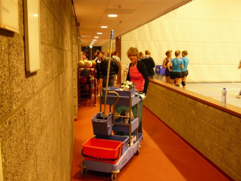 In het begin was het allemaal natuurlijk wel even wennen, want zoals met alles wat nieuw is, moet je overal even achter komen. Zo ontdekte Sinie dat de douches automatisch aangaan als je ervoor aan het dweilen bent, en Bennie dat het toch wel erg lang duurt met een normaal formaat veger de zaal door te moeten, die dan inmiddels ook vervangen is door een kingsize exemplaar.