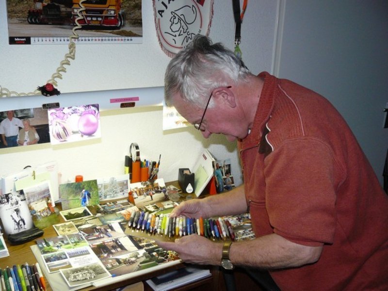 Overigens heeft de bijna 71 jarige onstwedder niet heel veel tijd om de boel in de gaten te houden, want hij heeft het behoorlijk druk met al zijn hobby’s; knutselen in zijn schuurtje, klaverjassen, maar vooral is hij zeer bedrijvig als het gaat om zijn pennen en miniatuurvrachtauto verzameling. Als hij ons zijn hobbykamer boven laat zien, toont hij vol trots zijn lichtgevende Coca Cola vrachtwagen die goed tot zijn recht komt in een mooie vitrinekast. Toch valt ons oog ook op de ladekasten aan de andere kant van de kamer, maar we hoeven niet lang te wachten op tekst en uitleg. De ene lade na de andere wordt geopend, en er komen hele series pennen netjes op een kartonnetje geschoven tevoorschijn. ‘Dit is mijn Onstwedder-pennenverzameling’, en we krijgen pennen te zien van verschillende bedrijven en instellingen uit Onstwedde. Hoe hij aan deze pennen komt? ‘Gewoon vragen’, is het antwoord. Wanneer zich een nieuw bedrijf in Onstwedde vestigt is Harm Lutjeboer er direct bij, en zo heeft hij vaak nog eerder de pen in bezit dan de werknemers van het bedrijf zelf. Maar deze verzameling van 80 Onstwedder-pennen stelt niet zoveel voor in vergelijking met de overige geschatte 40.000 stuks. Alles is keurig gesorteerd, maar een aantal soorten hebben toch een speciaal plekje. Zo ook een hele indrukwekkende serie buitenlandse pennen vanuit de hele wereld, vanuit België tot aan China. De meeste heeft hij gewoon gekregen; hij kreeg een tijdje geleden zelfs 7000 pennen van een vrouw wiens man bij de scheepvaart zat en die over de hele wereld voer.
