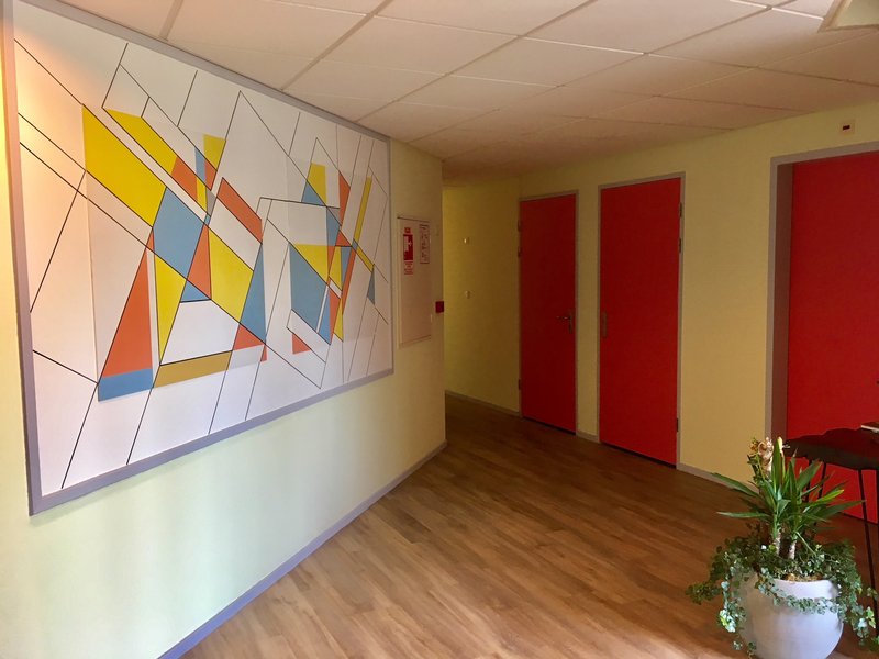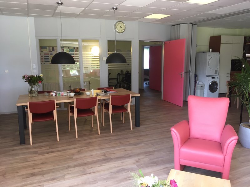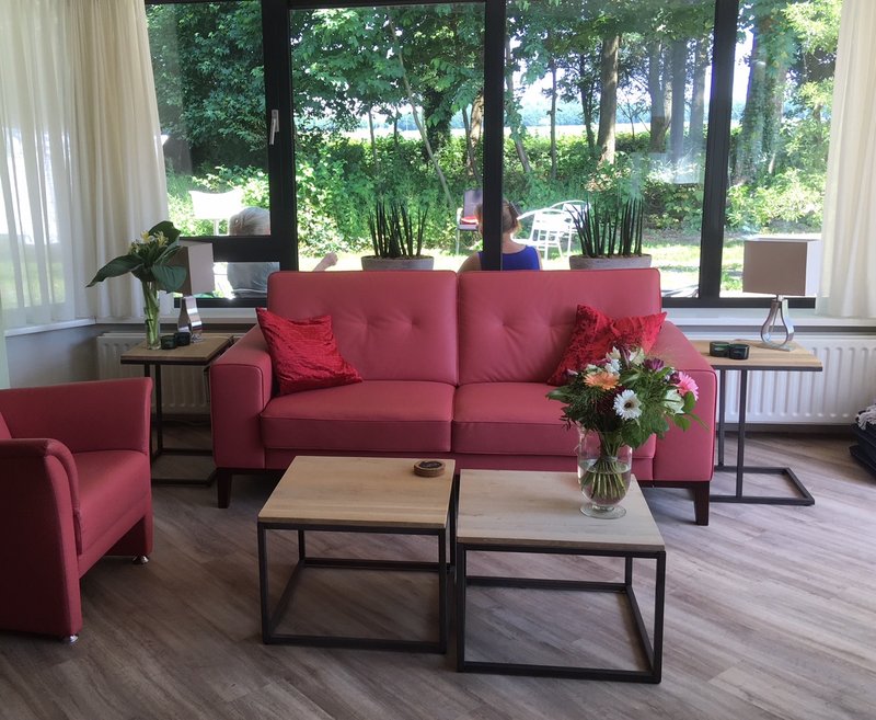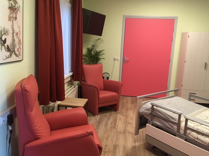 Ik heb nooit eerder een hospice bezocht, het is voor mij onbekend terrein. Wat mij opvalt bij binnenkomst is de huiselijke sfeer en de vrolijke kleuren. Het rode zitmeubilair en de houten vloeren doen warm aan.