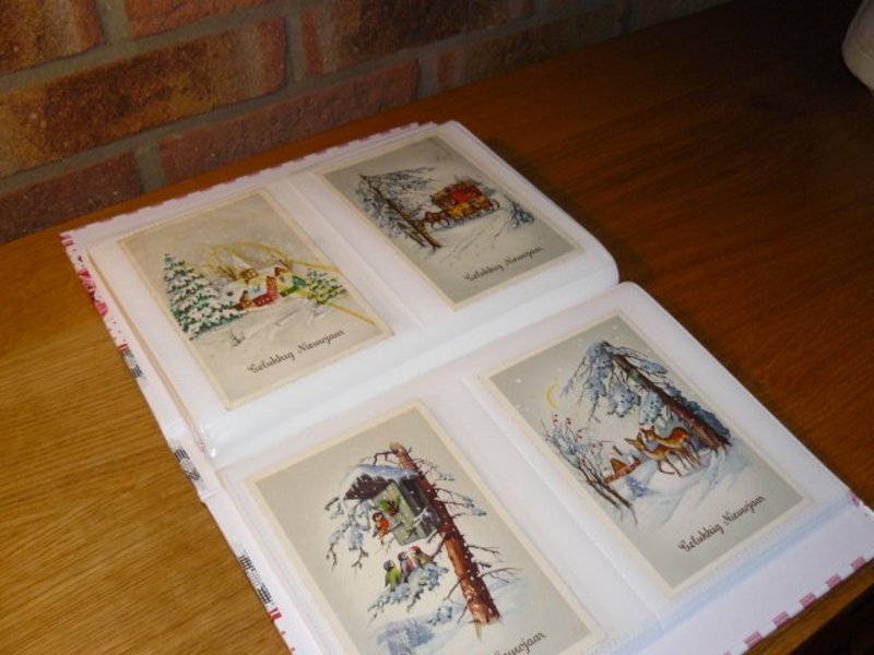 Kerstkaarten in alle soorten en maten, met verschillende dieren of andere plaatjes: ze spaart ze allemaal. De kaarten behoren namelijk tot een serie, waarvan van een groot deel jaarlijks een nieuw deel wordt uitgebracht, en zoals je ze in een pakketje in de winkel koopt, zoekt zij ze allemaal weer bij elkaar, waar ze soms hele dagen voor gaat zitten. Het begon twintig jaar geleden allemaal binnen de familie, maar al snel begonnen ook anderen hun kaartjes bij haar af te leveren. Publiciteit in de antiek & verzamel krant en natuurlijk de schakel droegen hier ook hun steentje haar bij. Wat haar mooiste kaarten zijn? Ze heeft een kleiner plakboek met allemaal kaartjes van vroeger, waarin ze kaartjes tegenkomt met postzegels van maar anderhalf cent!
