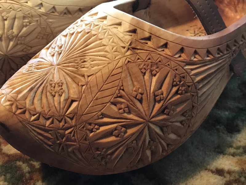 Vanwege de naam Fries kerfsnijwerk zou je denken dat dit ambacht uit Friesland komt. Niets is minder waar. Het kwam voor in het hele Noorden van Nederland en rondom de Zuiderzee. In eerste instantie werd het gebruikt om voorwerpen in het huis te versieren. Volgens Dirkje komt de benaming Fries van het feit dat vroeger balken in de kerk werden uitgesneden. Deze balken noemde men Friezen, vandaar de naam. Kenmerkend voor het snijwerk zijn de rozetten, sterren en vlechtfiguren. Het vakwerk wordt eerst op papier getekend, dit wordt op het werk gelegd en dan snijdt men de figuren uit. “Maar dat werkt niet op klompen vanwege de vorm,” zegt Dirkje. Zij tekent daarom de figuren rechtstreeks op de klomp zelf.