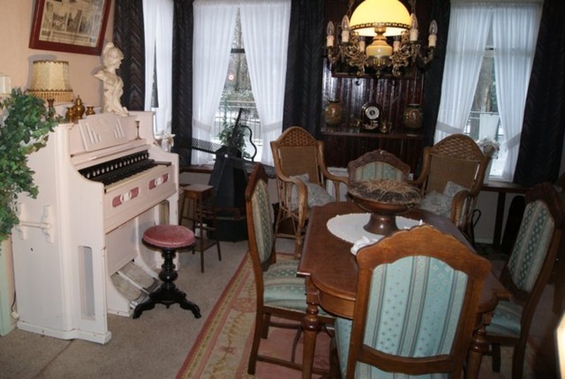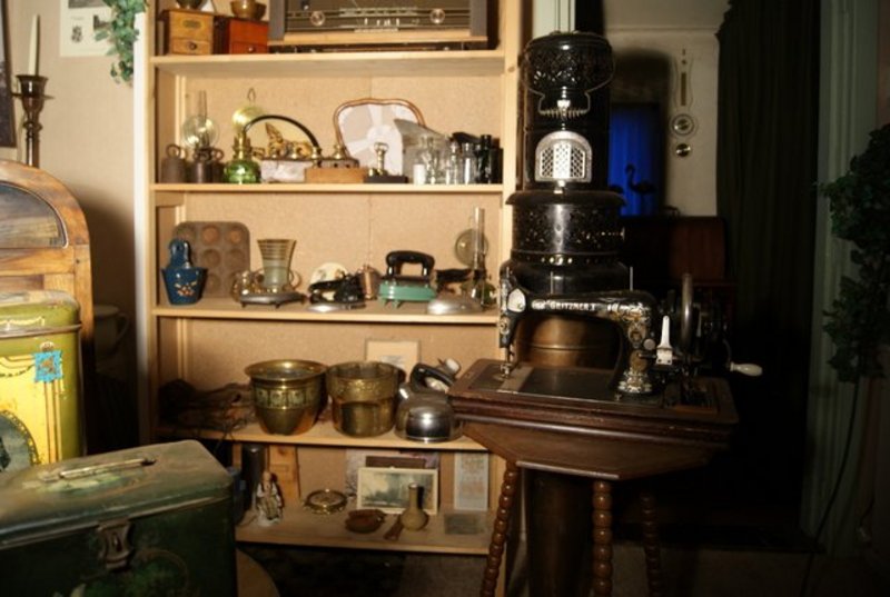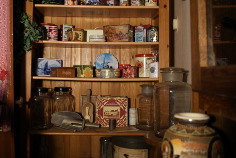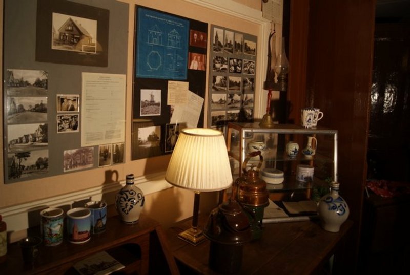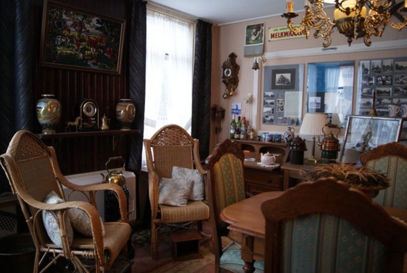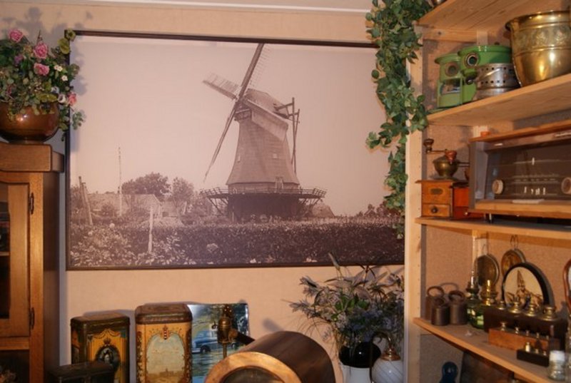 In de voorkamer zijn ze echter wel van allerlei gemakken voorzien: een oude verwarming uit de oorlogstijd, stoven voor de koude voeten en strijkijzers op gas voor als de stroom uitvalt. Een paar jaar geleden kwamen achter de muren van een huis verderop, een paar bedstee deuren te voorschijn, en ook deze staan nu bij Alex en Amalia in de kamer. Allemaal oude spullen, die anders maar in dozen op de zolder van de buren stonden te staan, en die nu bij hun in de woonkamer uitgestald staan. Wat vooral opvalt is de grote foto van een molen, die nog net geen halve muur in beslag neemt. Het is een foto van de molen bij hun in de tuin, die door blikseminslag nu nog maar deels overeind staat. Verder vinden we er nog allerlei spulletjes uit de kruidenierswinkel van grootouders Wubs, zoals blikken, gewichten en oude potten. Een oud orgel staat er voor de sier, want beiden zijn ze niet bepaald muzikaal aangelegd.