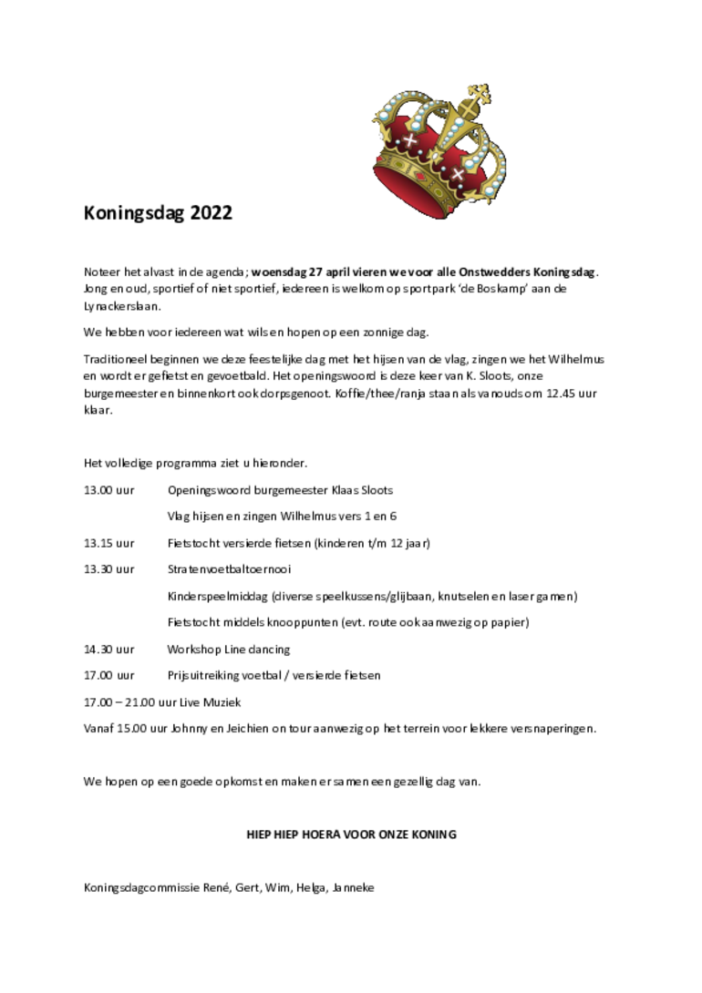 Noteer het alvast in de agenda; woensdag 27 april vieren we voor alle Onstwedders Koningsdag.