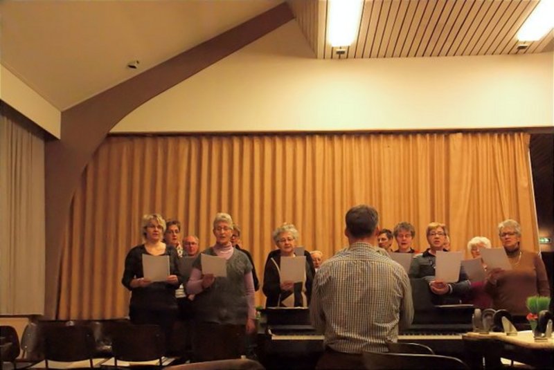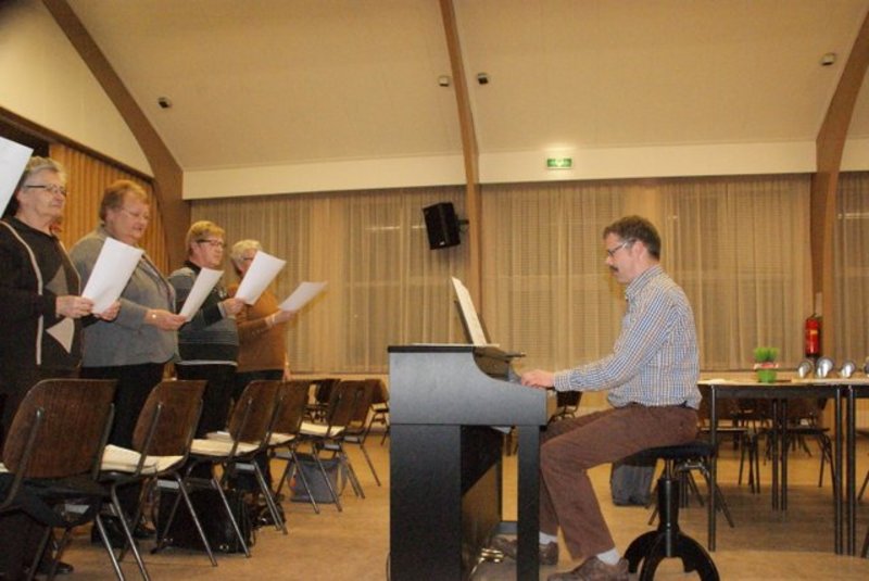We waren thuis bij hem op bezoek, maar we wilden natuurlijk wel graag een paar actiefoto’s schieten. Dus onze fotograaf heeft op een ander tijdstip nog even een bezoekje gebracht aan de repeteeravond van Nil Sine Labore in de Brinkhof. Hoewel het een gemengd koor is, zijn er toch veel meer vrouwen dan mannen, en dat is iets wat ook bij Loof den Heer het geval is. Roelie zou daarom graag zien dat er wat meer mannen bij de koren kwamen, dus bij deze om af te sluiten een kleine oproep…….