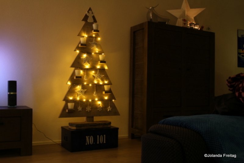 Foto 6 is de kerstboom van Geert Reints uit de Jensinghelaan. Het is een houten boom die Geert vorig jaar heeft gekocht, hij is er blij mee, want het past goed in de sfeer van zijn interieur.