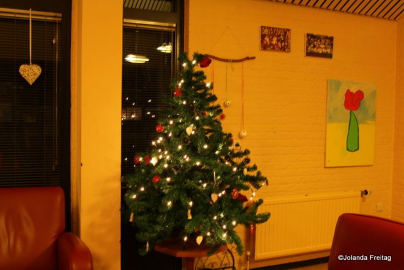 Foto’s 1 en 2 zijn genomen in de multifunctionele ruimte van de Woldstee, waar ze maar liefst twee kerstbomen hebben, één op tafel, en één op de grond. Veel bewoners uit de Woldstee drinken daar een kopje koffie, in een gezellige kerstsfeer. Ze waren bereid om mee te werken en vonden het erg leuk dat we langskwamen!