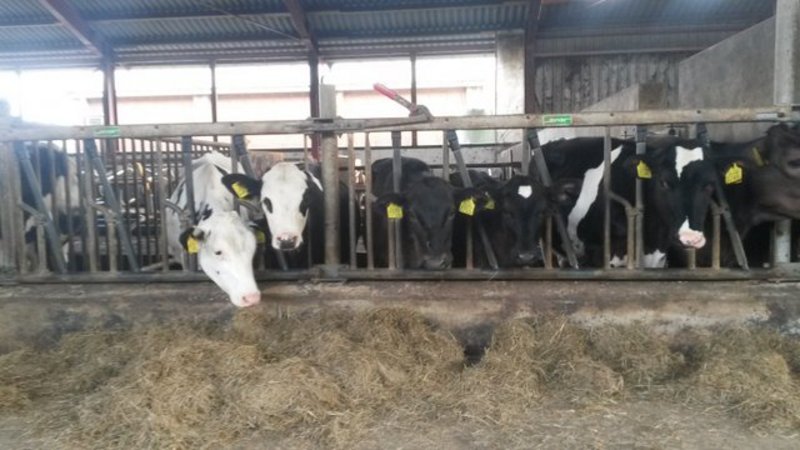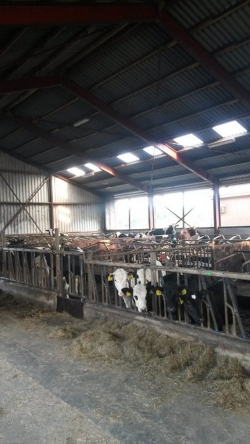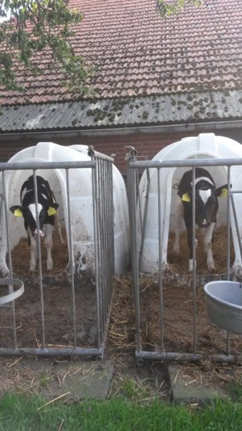 Na het bezichtigen van de keramiek koeien besluiten we nu maar eens de echte koeien te gaan bekijken, en voor we daar zijn komen we nog van alles tegen. De hond, een konijn, Zwanie haar paard waarmee ze met regelmaat een ritje door de omgeving maakt, en dan komen we aan bij het jongste grut, de kalfjes. Nieuwsgierig kijken ze op, maar besluiten uiteindelijk toch maar terug te deinzen in hun hok. Per jaar hebben ze zo'n 45 kalfjes en in totaal zijn er 100 koeien, allemaal verschillende soorten melkrassen.