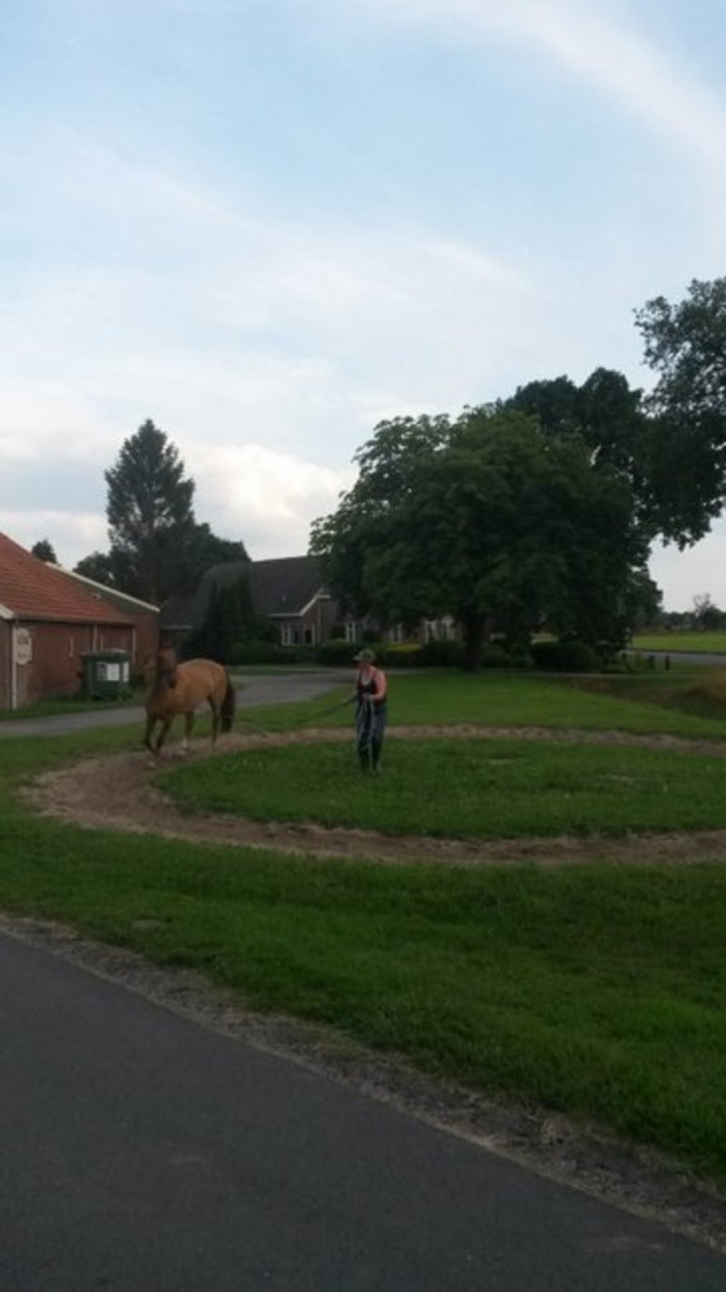 Als we weer weggaan heeft Zwanie het paard van stal gehaald, en longeert het over de volte langs de Kampweg. Ondanks dat dit voor de meeste Onstwedders een bekend beeld zal zijn schieten wij er nog even gauw een plaatje van en gaan dan weer terug het dorp in.