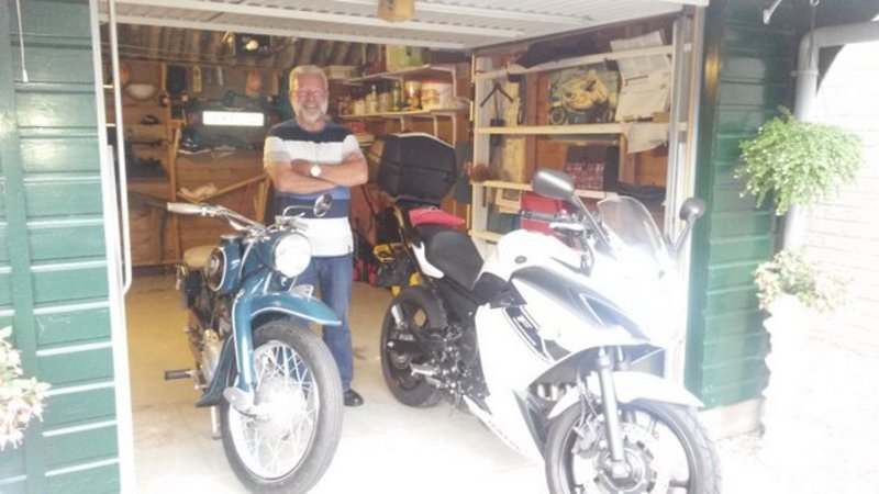 Daarna lopen we nog even mee naar de schuur, want ondanks dat het crossen verleden tijd is, staan er nog altijd drie motoren in de schuur, zijn oude motor en twee waar hij met toert. Hart voor motorrijden heeft hij altijd gehouden, en één keer in de maand gaat hij dan ook op zondag een dagje uit met de groep. Hij heeft ze van te voren al mooi voor ons opgesteld, en wil tot slot nog wel even voor ons poseren, zie hieronder het resultaat……