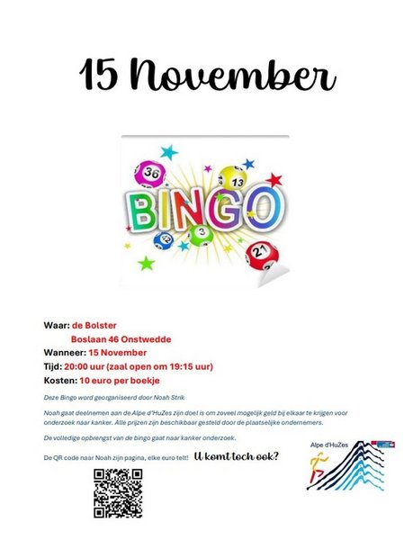 Noah Strik gaat deelnemen aan de Alpe d'Huzes. Zijn doel is om zoveel mogelijk geld bij elkaar te krijgen voor onderzoek naar kanker. Daarvoor organiseert hij een Bingo op 15 november. Alle prijzen zijn beschikbaar gesteld door de plaatselijke ondernemers (zoals de bakker, slager, snackbar 't Wold, kapper Eline, de Supermarkt, Wubs en bakker Frans, De Blokker, de DA van Vlagtwedde). Dus er zijn mooie prijzen te winnen.