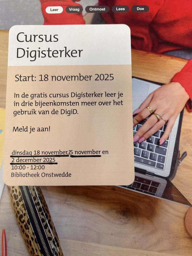 Heeft u al een beetje computerkennis en wilt u meer leren? Doe dan mee met de gratis cursus Digisterker. In 3 bijeenkomsten leer je meer over het gebruik van DigiD. Meld je aan in de bibliotheek of via de website/agenda.
