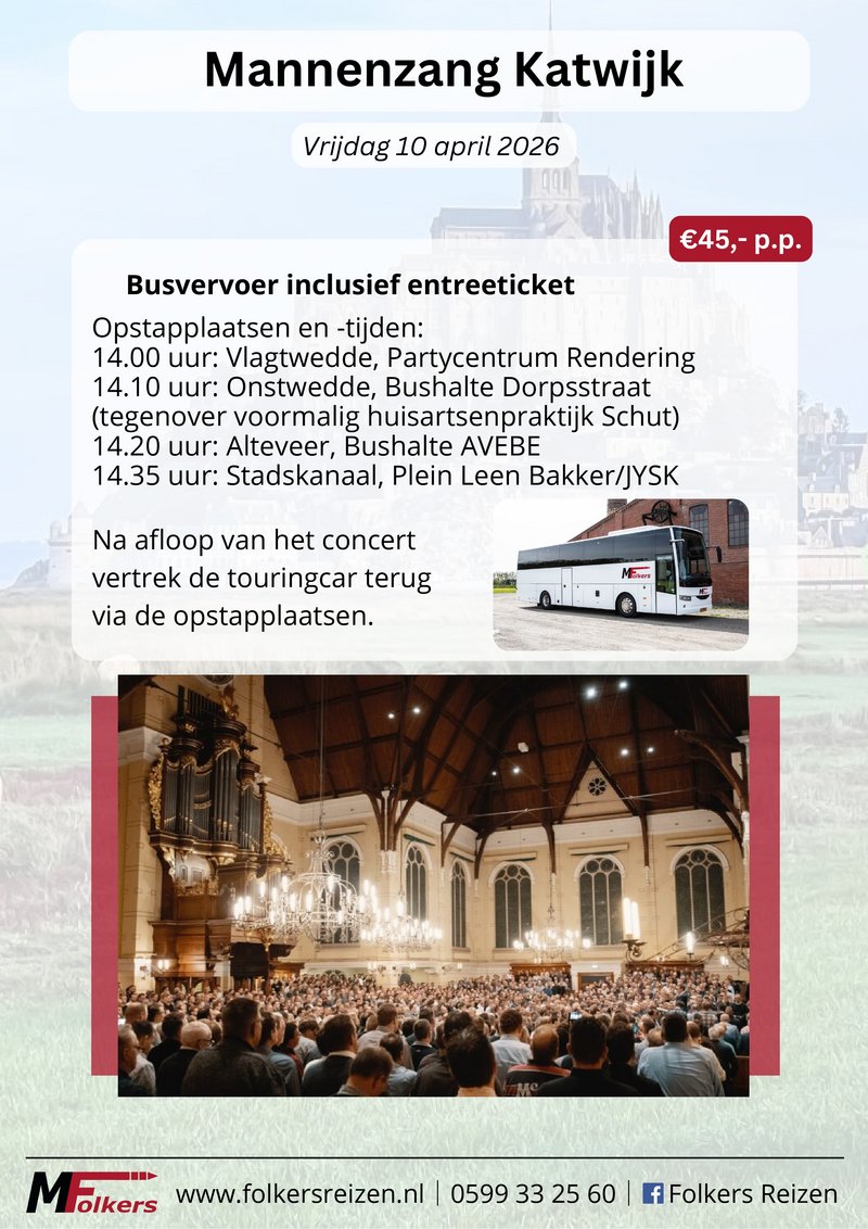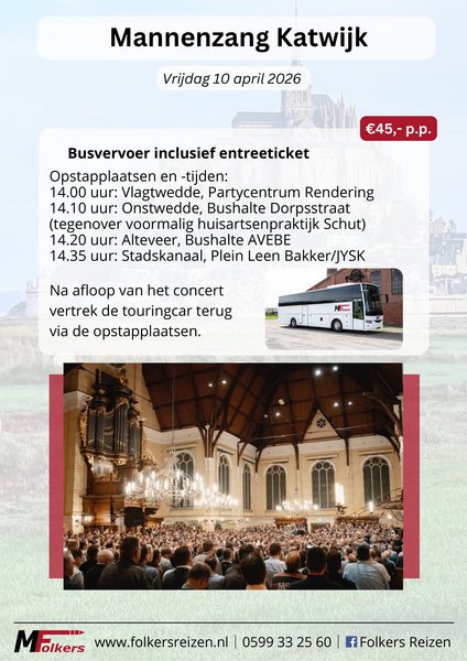 - Folkers Reizen naar Mannenzangavond Katwijk op 10 april