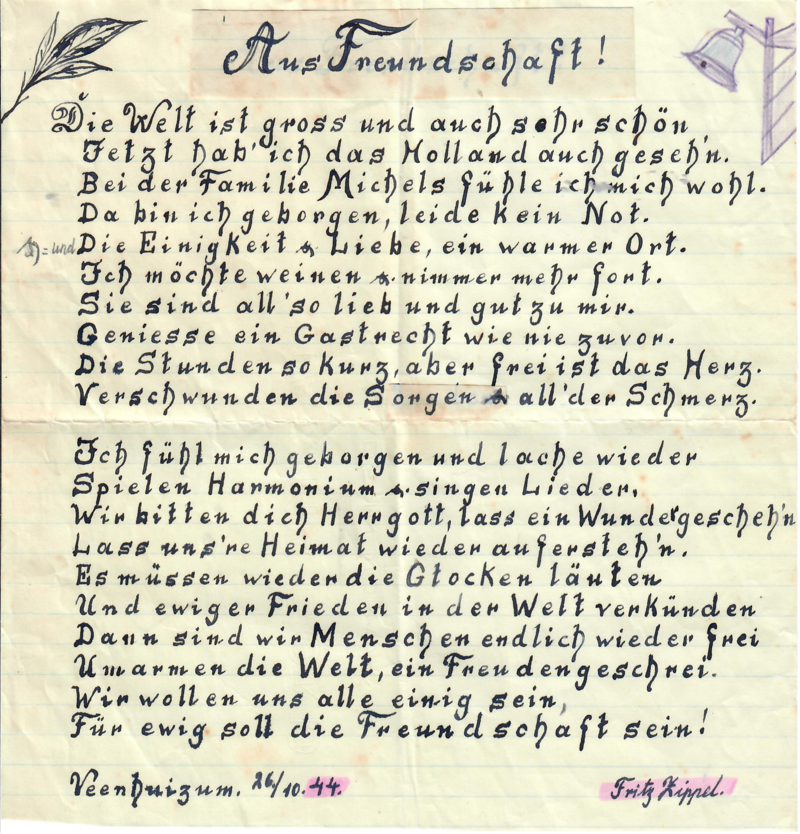Op tweede Kerstdag is de 10e verjaardag van Jopie, de jongste van het gezin. Fritz klimt voor haar weer in de pen. Hij schrijft, beginnend met halfbakken Nederlands en verder in zijn moerstaal: “Liebe kleine Joppi! Hartelik gefiliciteerd zum Gebrtstag, viel Glück und alles Gute wünscht Dir den fröhliche Fritz.” Op de achterkant doet hij een poging in het Nederlands te schrijven – en dat lukt hem heel aardig! Jarige Jopie is blij met het mooie kaartje en bewaart het goed.