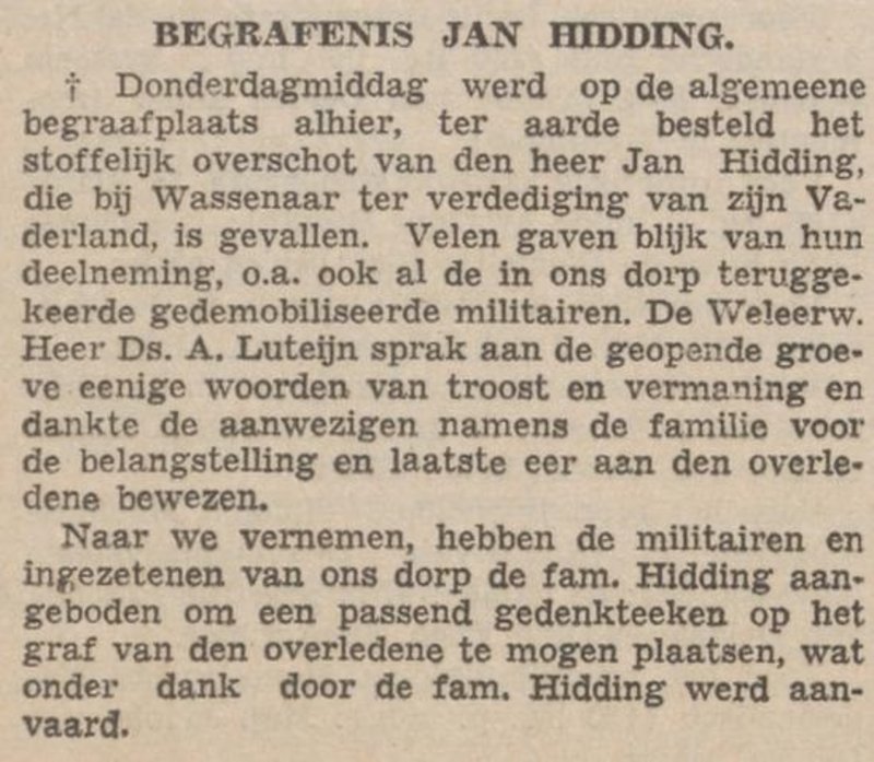 Ook ons dorp moest zijn aandeel daarin bijdragen in den persoon van Jan Hidding. Niet licht zal worden vergeten de dag waarop deze jonge man naar zijn laatste rustplaats werd gebracht, waarbij hem niet alleen door zijn Onstwedder wapenbroeders, maar door talloos velen uit ons dorp en omgeving de laatste eer werd bewezen. Toen ervoeren wij van zeer nabij hoe wreed de oorlog is en waren getuige van de diepe smart van de ouders van deze voor zijn vaderland gevallen jonge man.