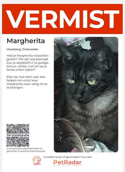 Heb je Margherita misschien gezien? We zijn erg bezorgd. Zou je alsjeblieft in je garage, schuur, zolder, tuin en op je terras willen kijken?