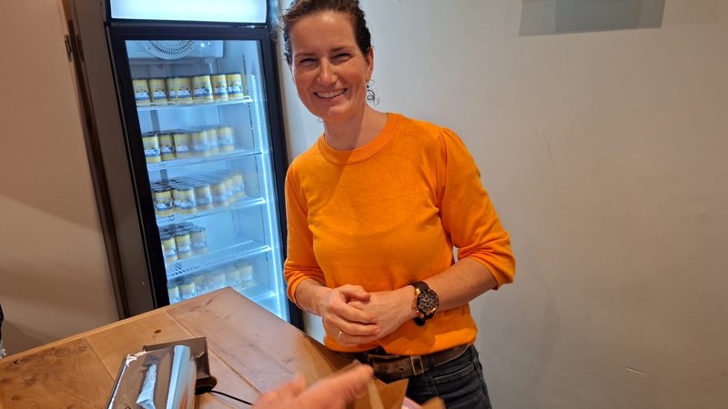 Hun boerderij telt 135 melkkoeien. Zij en haar man melken dagelijks de koeien, met een melkrobot. Voor de mest opruimen hebben ze een mestrobot. Elk jaar gaan de koeien naar buiten, maar ze twijfelt of ze hen dit jaar ook naar buiten doet. Ten eerste hebben ze daar ook last van de wolf en ten tweede moet ze voldoen, van de regering, aan een x aantal kg mest. Momenteel komt ze daar niet aan toe. En in de wei krijg je immers minder mest dan op stal. Enkele jaren terug heeft ze een nieuwe stal gebouwd. Van het oude niet meer gebruikte deel hebben ze een ontvangstruimte van gemaakt.