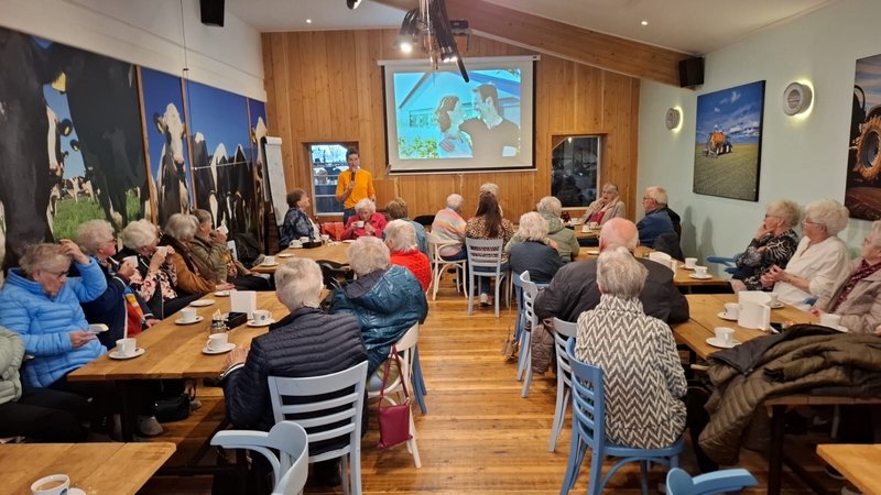 Bij haar boerderij aangekomen werden we eerst voorzien van koffie/thee met cake. Ze vertelde hoe zij als eerste boerin aan het programma boer zoekt vrouw meedeed. Uiteindelijk is zij met geen van de kandidaten getrouwd, maar heeft zij de liefde van haar leven 12 kilometer bij haar vandaan gevonden. Zij hebben samen drie kinderen. Zij hebben nog heel veel contact met de andere boeren, die ook meegedaan hebben met het programma. Ze zijn er altijd voor elkaar. Onlangs heeft boer Geert een ongeluk gehad in Portugal en alle boeren hebben hem een kaart gestuurd. Na de pauze, waar een tweede kop koffie/thee werd aangeboden vertelde Agnes over hun boerderij.