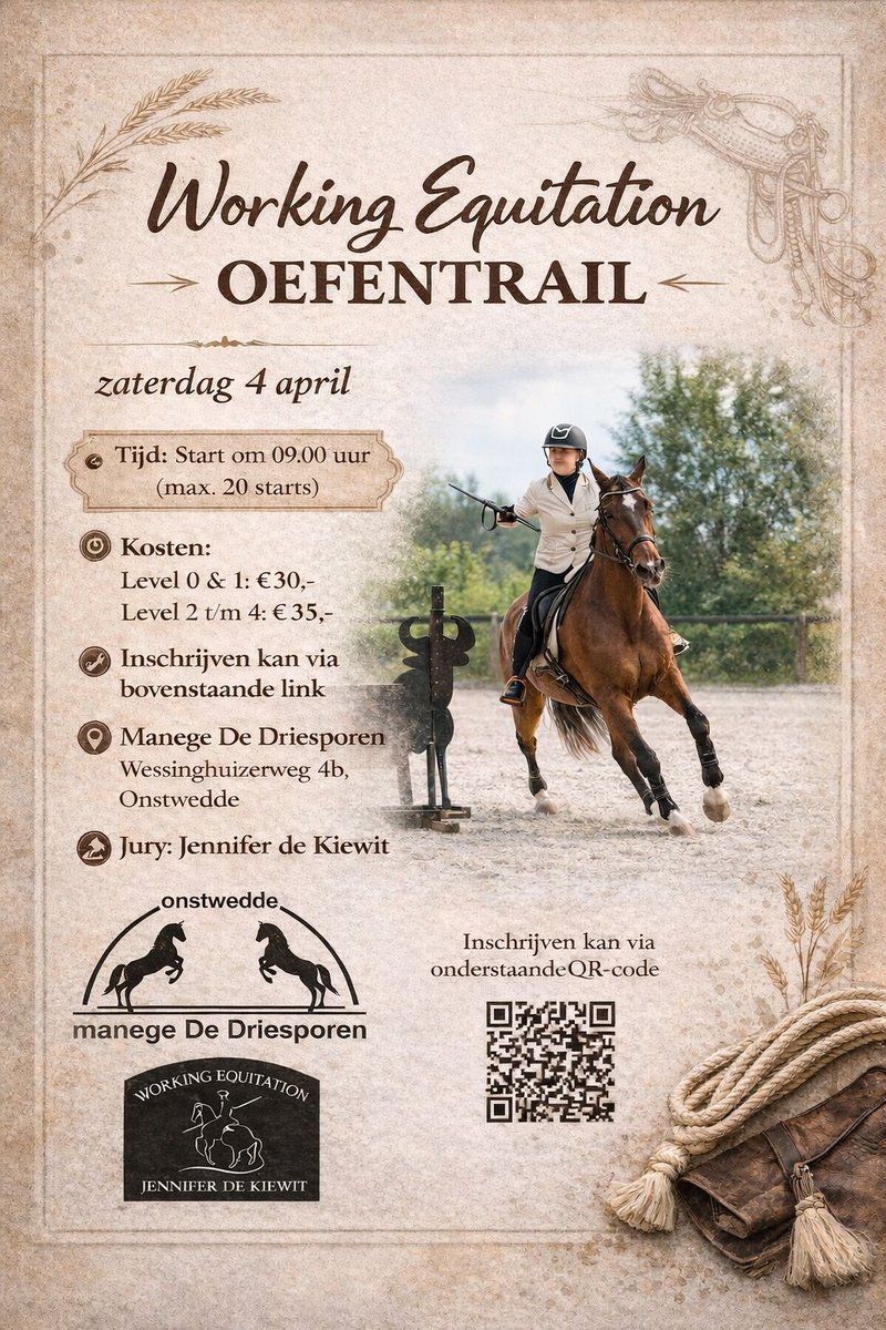 Op zaterdag 4 april vindt een oefentrail Working Equitation plaats, verzorgd door Jennifer de Kiewit.