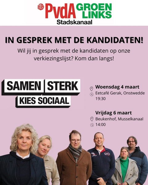 Wil jij in gesprek met de kandidaten op de kieslijst van PvdA / Groen Links Stadskanaal?