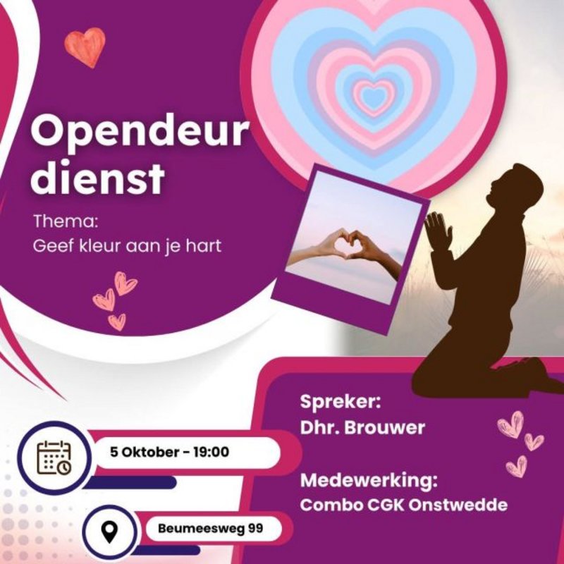 Op zondag 5 oktober vindt er een Opendeur dienst plaats in Alteveer, met medewerking van Combo CGK uit Onstwedde.
