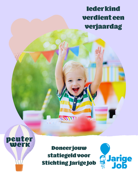 Van 2 tot en met 31 maart organiseert Stichting Peuterwerk een inzamelactie van statiegeldflessen en - blikjes op al haar locaties. De opbrengst gaat volledig naar Stichting Jarige Job, zodat ieder kind een verjaardag kan vieren.