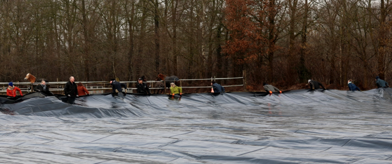 - Vrijwilligers helpen bij uitrollen folie nieuwe buitenbak manege De Driesporen