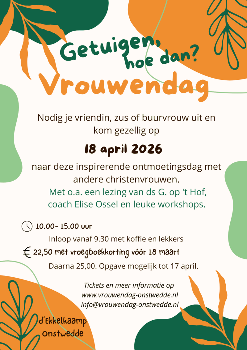 Op D.V. 18 april houden we opnieuw een Vrouwendag in d'Ekkelkaamp. Deze dag zal in het teken staan van Gods getuigen zijn. In het ochtendprogramma neemt Ds. op 't Hof ons mee in wat de Bijbel hierover te zeggen heeft. Na een uitgebreide lunch kan er gekozen worden uit 9 leuke workshops. Daar zit vast voor iedereen iets leuks bij!