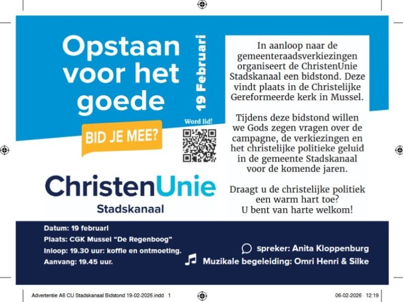 In aanloop naar de gemeenteraadsverkiezingen organiseert de ChristenUnie Stadskanaal een bidstond. Deze vindt plaats in de Christelijke Gereformeerde kerk in Mussel. Thema: Opstaan voor het Goede