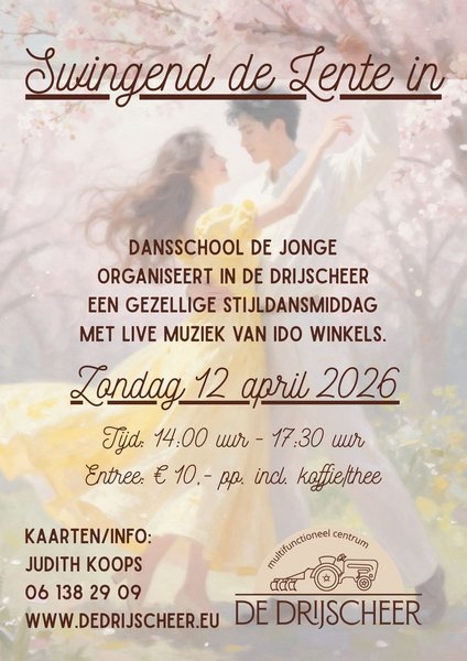 Zondag 12 april 2026 organiseert Dansschool de Jonge een gezellige dansmiddag, Ido Winkels zorgt voor de live muziek. Het is een mooie gelegenheid om te genieten van hits van toen en nu. De middag is bedoeld voor iedereen die van dansen houdt: van jong tot oud, beginner of gevorderde.