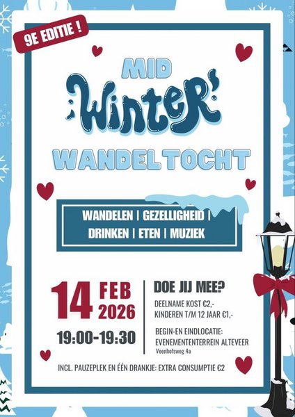 9e Editie van de Mid Winter Wandeltocht in Alteveer op 14 februari. Opgave vanaf 19.00 - 19.30 uur. Begin- en eindlocatie Evenemententerrein Alteveer, Veenhofsweg 4a.