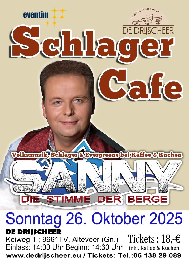 De vorige edities van ons Schlagercafe werden weer vrolijke en gezellige middagen. Daarom verwelkomen wij Sanny, die Stimme der Berge wederom op zondag 26 oktober 2025 in De Drijscheer.
